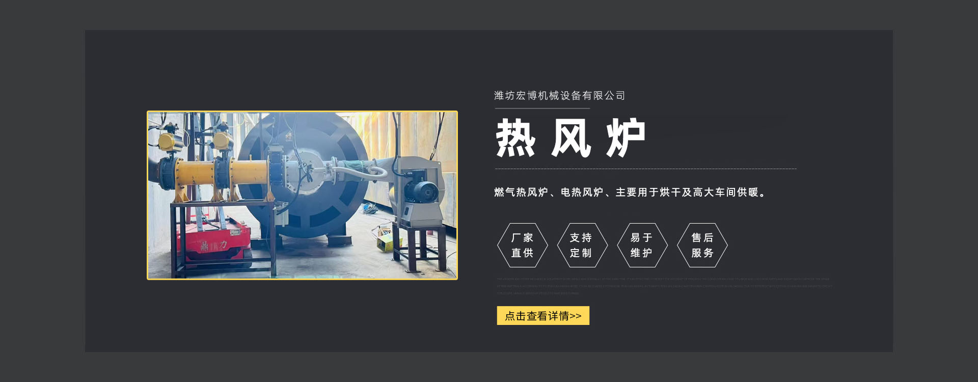 濰坊宏博機(jī)械設(shè)備有限公司是從事熱風(fēng)爐、烘干設(shè)備、供暖設(shè)備的研發(fā)、設(shè)計(jì)、制造和服務(wù)于一體的實(shí)體企業(yè)。長期以來,企業(yè)以市場(chǎng)的發(fā)展和客戶的需求為導(dǎo)向,集多年的生產(chǎn)技術(shù)與經(jīng)驗(yàn)為一體,不斷開發(fā)和優(yōu)良產(chǎn)品。